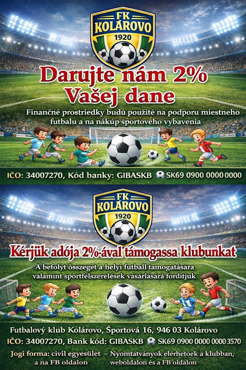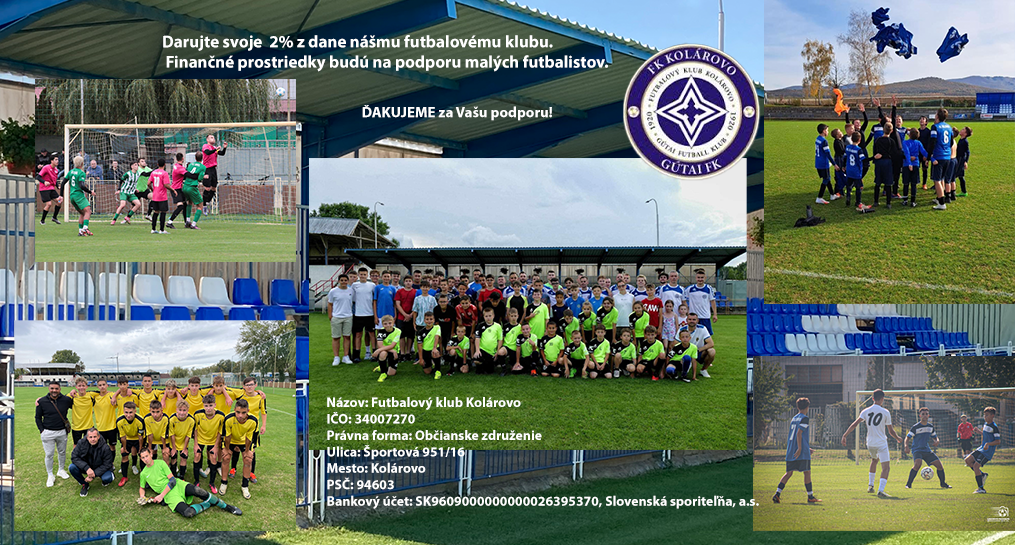 Kérünk minden szurkolót, szülőt, játékost és támogatót, hogy személyi jövedelemadója 2%-ának felajánlásával támogassa az FK Kolárovo működését.
